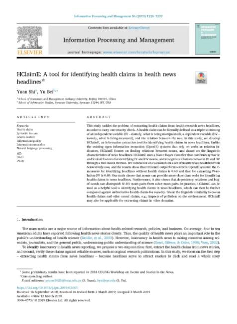 Shi Yuan and Bei Yu. HClaimE: A Tool for Identifying Health Claims in Health News Headlines. Information Processing and Management. 2019, 56(4): 1220-1233. 国际B期刊