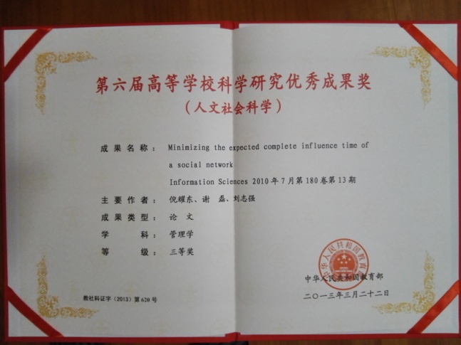 成果概况:该成果获得教育部第六届高等免费a片 科学研究优秀成果奖(人文社会科学)三等奖(论文奖)。此论文是社会网络影响扩散理论中的一项重要成果。此论文研究了社会网络中的优势影响的扩散机制与扩散优化问题,创新性地提出了递增机会模型,给出了递增机会模型的数学性质。此论文提出了社会网络期望完全影响时间最小化问题,建立了该问题的决策模型,设计了基于贪婪算法的启发式算法框架,并实施了一系列实验以验证算法的有效性和稳定性。