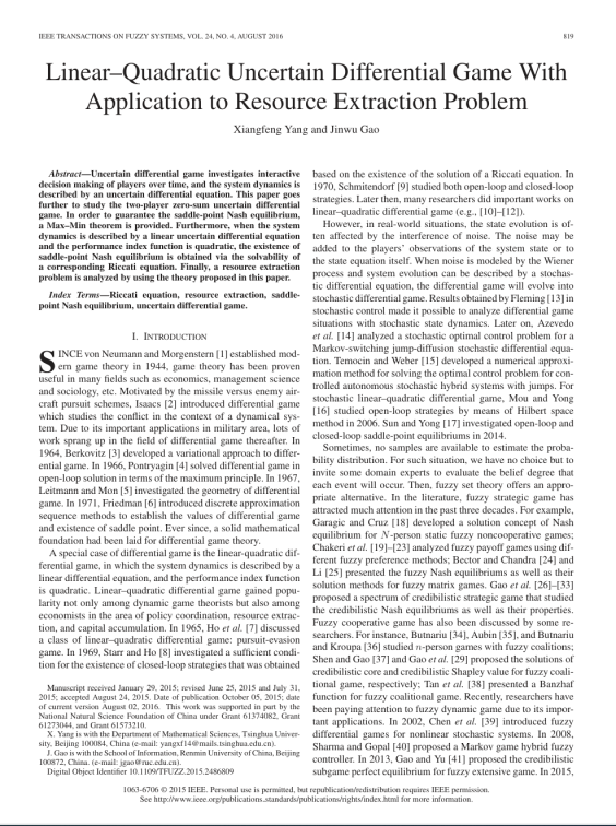 基于不确定理论,本论文提出由不确定微分方程驱动的不确定微分博弈。在期望值准则下定义其反馈Nash 均衡解, 并证明两人零和不确定微分博弈的最大最小定理。此外,通过引入一个Riccati 微分方程, 证明了该Riccati 方程解的存在性是相应线性二次不确定微分博弈存在反馈鞍点Nash 均衡解的充分条件,且最优控制一定是线性控制。如果一个线性二次不确定微分博弈的线性控制是最优的,证明对应Riccati 方程一定有解。最后, 给出不确定微分博弈在资源消耗问题中的应用。