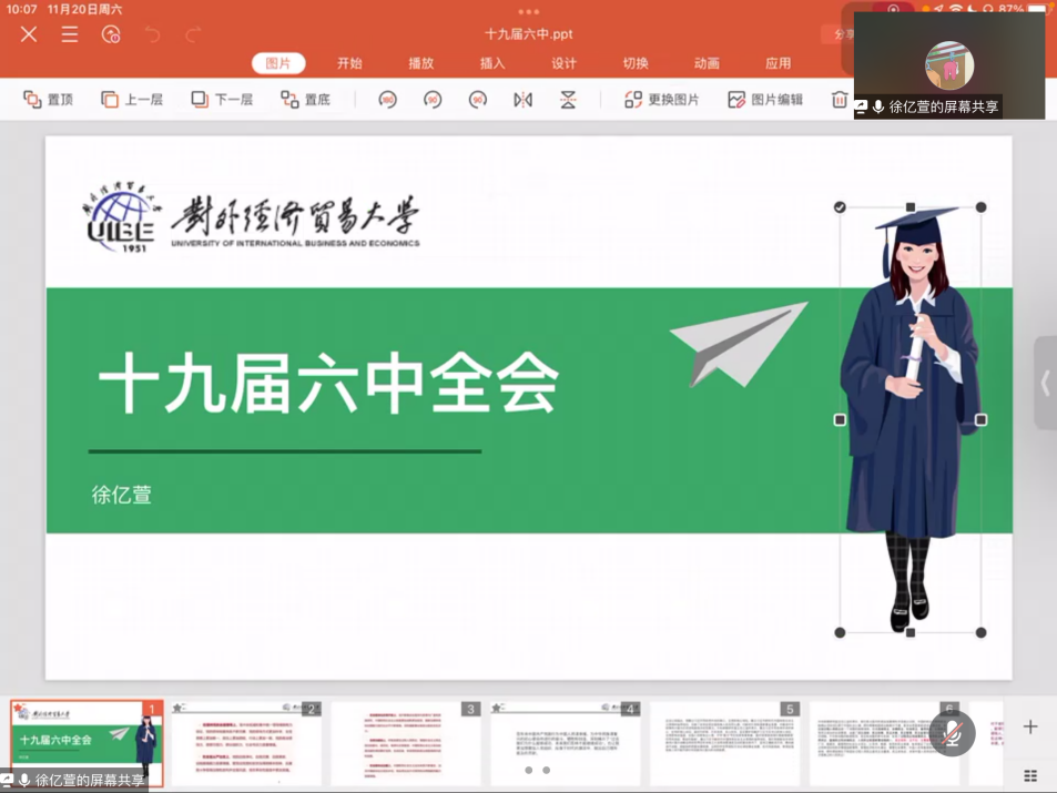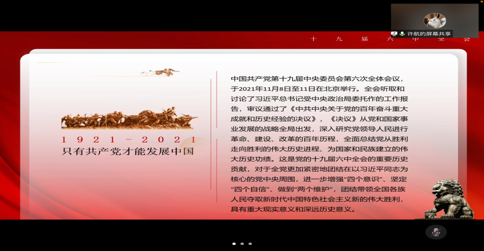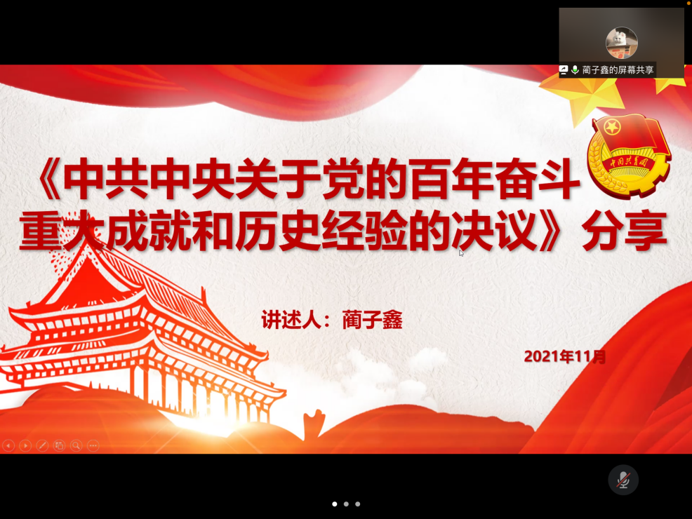 (信息免费a片 预备党员王心怡讯)2021年11月8日至11日十九届六中全会顺利召开,会议上审议通过了《中共中央关于党的百年奋斗重大成就和历史经验的决议》。为深入贯彻落实相关思想与精神,信息免费a片 本科生第一党支部和惠新里第二党支部于2021年11月20日上午开展了“扛起光荣使命,书写时代华章”时事热点学习交流会,组织广大同学学习十九届六中全会相关内容,并展开线上感想分享。离退休处徐文兵处长,惠新里第二党支部黄震华老师、丁崇文老师、戚淑茹老师、车洪波老师、曹心竹老师,信息免费a片 本科生第一党支部黄伟钊老师及26名同学和参加了活动,由刘鑫同学组织活动流程。