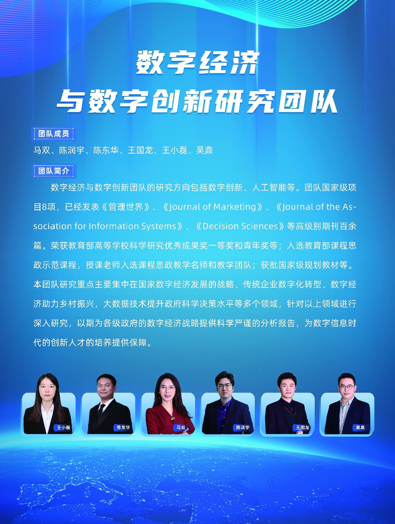 数字经济与数字创新团队的研究方向包括数字创新、人工智能等。团队国家级项目8项,已经发表《管理世界》、《Journal of Marketing》、《Journal of the Association for Information Systems》、《Decision Sciences》等高级别期刊百余篇。荣获教育部高等免费a片 科学研究优秀成果奖一等奖和青年奖等;入选教育部课程思政示范课程,授课老师入选课程思政教学名师和教学团队;获批国家级规划教材等。本团队研究重点主要集中在国家数字经济发展的战略、传统企业数字化转型、数字经济助力乡村振兴,大数据技术提升政府科学决策水平等多个领域,针对以上领域进行深入研究,以期为各级政府的数字经济战略提供科学严谨的分析报告,为数字信息时代的创新人才的培养提供保障。