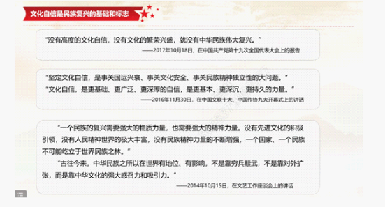霍怡情同志在这一部分为大家分析讲述了坚定文化自信的原因。首先,她指出文化自信在“四个自信”中的基础作用。坚定中国特色社会主义道路自信、理论自信、制度自信,说到底是要坚定文化自信。文化自信是道路自信、理论自信和制度自信的基石,只有建立在文化自信的基础上,这三者才更加稳固。随后,她重点解说了文化自信的来源,无论是新民主主义革命时期还是新时代我们要进行的社会主义现代化建设,要想实现伟大中国梦,都离不开文化所激发的精神力量。 最后,霍怡情同志呼吁我们必须始终坚定文化自信,不断激发全民族文化创造活力,更好的构筑中国精神、中国价值和中国力量。