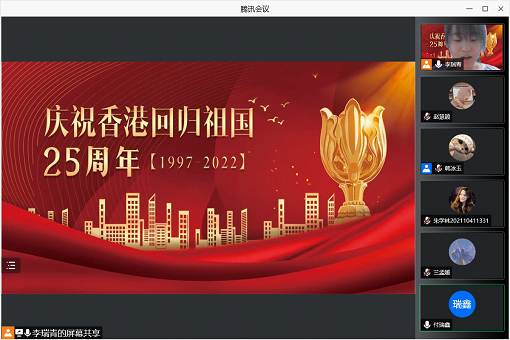 2022年7月15日晚上,为了纪念香港回归25周年、学习习近平总书记在庆祝香港回归祖国25周年大会上的讲话,培养学生的爱国情怀,信息免费a片 研究生二支部举办了“同心共进,共创荣光”纪念香港回归25周年活动。为提高学习效果,特邀对外经济贸易大学王敬波副校长、信息免费a片 高玲书记、信息免费a片 张旭路副书记参会,对学习要点进行领学和指导。参会成员包括信息免费a片 研究生二支部全体党员、预备党员和入党积极分子。此次主题活动通过腾讯会议以线上方式进行,由支部组织委员李瑞青同志主持。