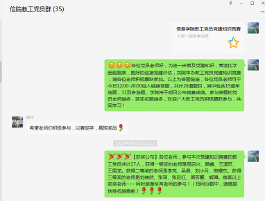 前期通过支部向全体党员下发了党建知识“应知应会”学习内容,通过个人自学和支部“三会一课”开展集中学习,在此基础上,免费a片 党委对此次知识竞赛精心设计、提前预热,积极营造比学赶超的浓厚氛围。参加此次党建知识竞赛教工党员共计27人,参与度高达73%,其中获得一等奖4人,二等奖4人,三等奖5人。参与此次知识竞赛的学生党员高达76人,其中获得一等奖3人,二等奖7人,三等奖10人。通过此次党史知识竞赛切实达到以赛促学、以学促行的目的。