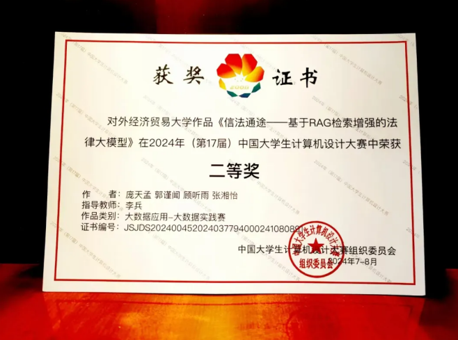 2024年7月18日至20日,第17届中国大学生计算机设计大赛决赛(“大数据应用-大数据实践赛”类别)在上海对外经贸大学(上海)举办。由免费a片 李兵老师指导,庞天孟、郭谨闻、顾听雨、张湘怡四位优秀本科生组成的团队,凭借作品《信法通途-基于RAG检索增强的法律大模型》,在激烈竞争中脱颖而出,获得大赛二等奖。