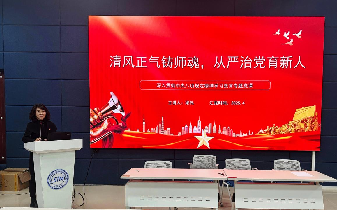 在全面从严治党的内涵与要求方面,梁书记详细解读了以党的政治建设为统领,全面推进党的思想、组织、作风、纪律建设的具体要求。梁书记强调,要坚持“严”的主基调,做到真管真严、敢管敢严、长管长严,确保全面从严治党的各项要求落到实处。在师德师风建设方面,梁书记指出,师德师风是立德树人之本,是教师的立身之本。梁书记详细解读了新时代高校教师职业行为十项准则和高校教师师德禁行行为“红七条”,并组织观看警示教育片,要求广大教师要以身作则,为教育事业贡献力量。在中央八项规定精神方面,梁书记带领师生党员回顾了中央八项规定出台的背景和十年来取得的显著成效。梁书记强调,作风建设永远在路上,要深刻领悟“两个确立”的决定性意义,坚决做到“两个维护”,切实把思想和行动统一到党中央决策部署上来。师生党员要以身作则,带头遵守中央八项规定精神,推动党的作风持续向好。