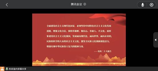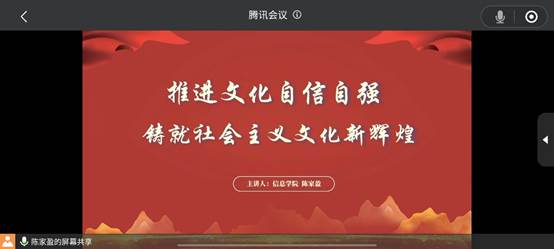 2023年5月11日,为学习贯彻党的二十大中“文化自信”的重要精神,深入推进主题教育支部书记讲党课活动的开展,信息免费a片 研究生一支部组织了以“推进文化自信自强,铸就社会主义文化新辉煌”为主题的线上党课教育活动。党课主讲人为研究生一支部书记陈家盈。
