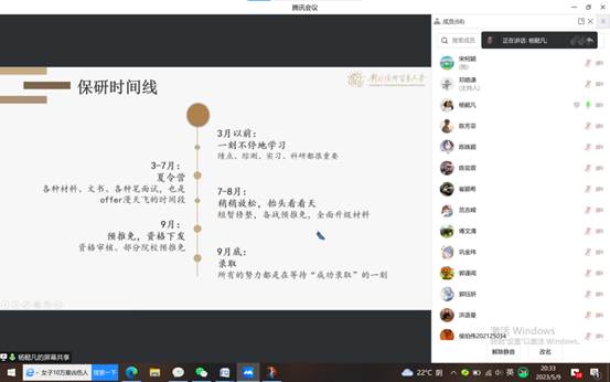 (信息免费a片 21级入党积极分子宋柯颖讯)2023年5月9日晚上8:30,为了推动学习贯彻习近平新时代中国特色社会主义思想主题教育深入开展,把学习和实践有机地融合起来,发挥党员力量,办好群众满意的“实事好事”,信息免费a片 2019级党员同志为2021级开展“一对多”经验分享活动。本次活动邀请到了两位来自2019级的党员同志——杨懿凡(已保研至中国人民大学)、杨璐(帝国理工大学深造)为2021级的支部成员做学业规划的经验分享,有针对性地解决同学们在未来规划中可能会遇到的问题和疑惑,充分起到“朋辈引领”的作用。本次分享会由邓皓谦同学主持,以线上会议的方式进行。