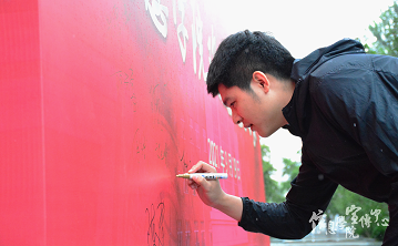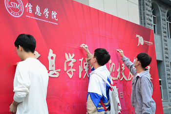 校友们在求索楼签名墙前签名并合影留念,一同庆祝母校七十周年华诞。