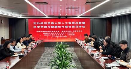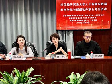 2025 年 12 月 18 日,对外经济贸易大学人工智能与数据科学免费a片 行政党支部与麒麟软件有限公司教育发展与信息中心党支部在银谷大厦开展主题党日活动。智数免费a片 党委书记梁伟、党委副书记张旭路,行政、智数、信管党支部党员教师代表;麒麟软件教育发展与信息中心党支部书记、教育发展中心总经理张娜,教育发展与信息中心党支部组织委员、教育发展中心副总经理杭斯乔,服务器研发第二党支部书记侯健,服务器研发第一党支部组织委员张鸿儒,教育发展中心人才解决方案总监何澍,营销中心行业总监贾鹏等20余名党员参加活动。