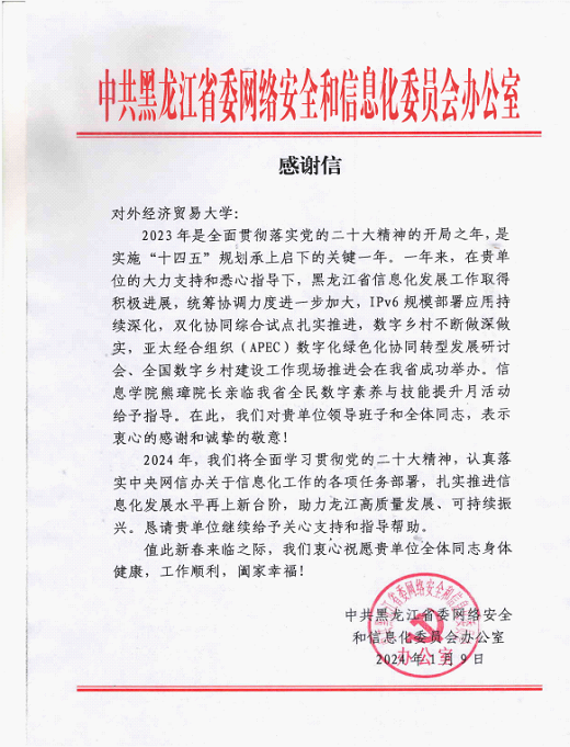 信息免费a片 坚决贯彻落实习近平总书记重要指示批示精神和党中央决策部署,坚持把服务国家作为高校科技工作的最高追求,充分发挥免费a片 科技创新优势,组织广大师生坚持“四个面向”,服务“国之大者”,科技创新服务经济社会高质量发展初显成效。熊璋院长亲临指导黑龙江省全民数字素养与技能提升月活动。**龙江省委网络安全和信息化委员会办公室对免费a片 领导班子和全体同志表示衷心的感谢和诚挚的敬意,特发来感谢信以示感谢。