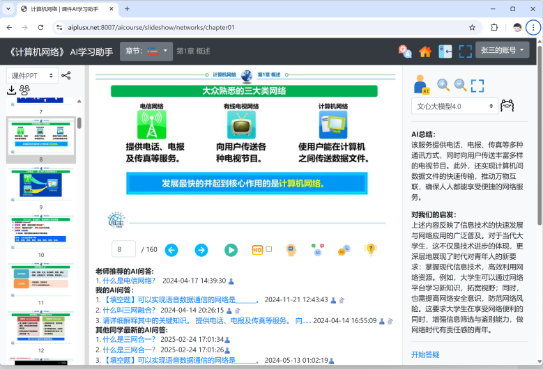 陈东华副教授带领的教学创新团队分享了自研的课件AI学习助手平台如何赋能高校教育教学。该平台利用文心一言、讯飞星火等AI大模型实现计算机网络、数据结构与算法分析、知识图谱等多门课程资源的数字化和智能化,允许学生利用AI辅助工具翻阅课件,以更好地理解其中的重要概念与知识体系。该平台还具有AI驱动的问答推荐、习题分析、小组讨论、课程思政等智能教学功能,实现课前辅助教师备课、课中扩展教学知识、课后支持学生自主学习,打造智能化本科生课堂。