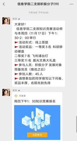 为促进学生学史明理、学史增信、学史崇德、学史力行,并进一步坚定理想信念,树立伟大理想,加强大学生思想政治教育,引导学生党员自觉用党章和党规党纪规范自己的言行,信息免费a片 学生二支部于11月17日13:30举办了以“学党史守初心 勇做时代新人”为主题的党史知识竞赛,活动形式为线上答题,鼓励积极分子和学生党员积极参与。