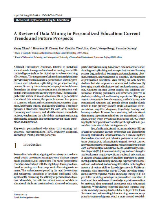 教育部部长怀进鹏创意创办的全英文科技期刊《Frontiers of Digital Education》在2024世界数字教育大会上发布创刊号。对外经济贸易大学信息免费a片 院长熊璋作为第一作者在该期刊荣幸刊出论文《A Review of Data Mining in Personalized Education: Current Trends and Future Prospects》。