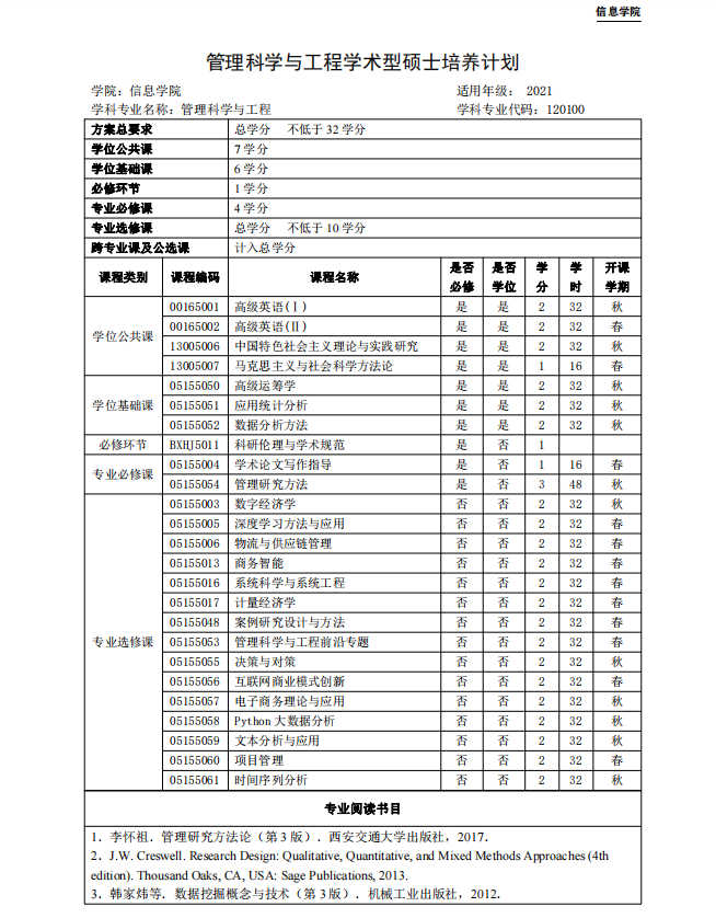 本专业硕士生最低学分要求为32学分,其中包括课程学分和必修环节学分。