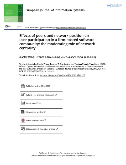 Xiaolei Wang, Terence T. Ow, Luning Liu, Yuqiang Feng, Yuan Liang. “Effects of peers and network position on user participation in a firm-hosted software community: the moderating role of network centrality.” European Journal of Information Systems. 2020, 29(5): 521-544.